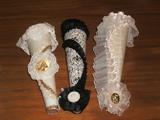 This box is wrapped in fabric and drapped with trim, ribbon, and to top it off flowers are on the top.
